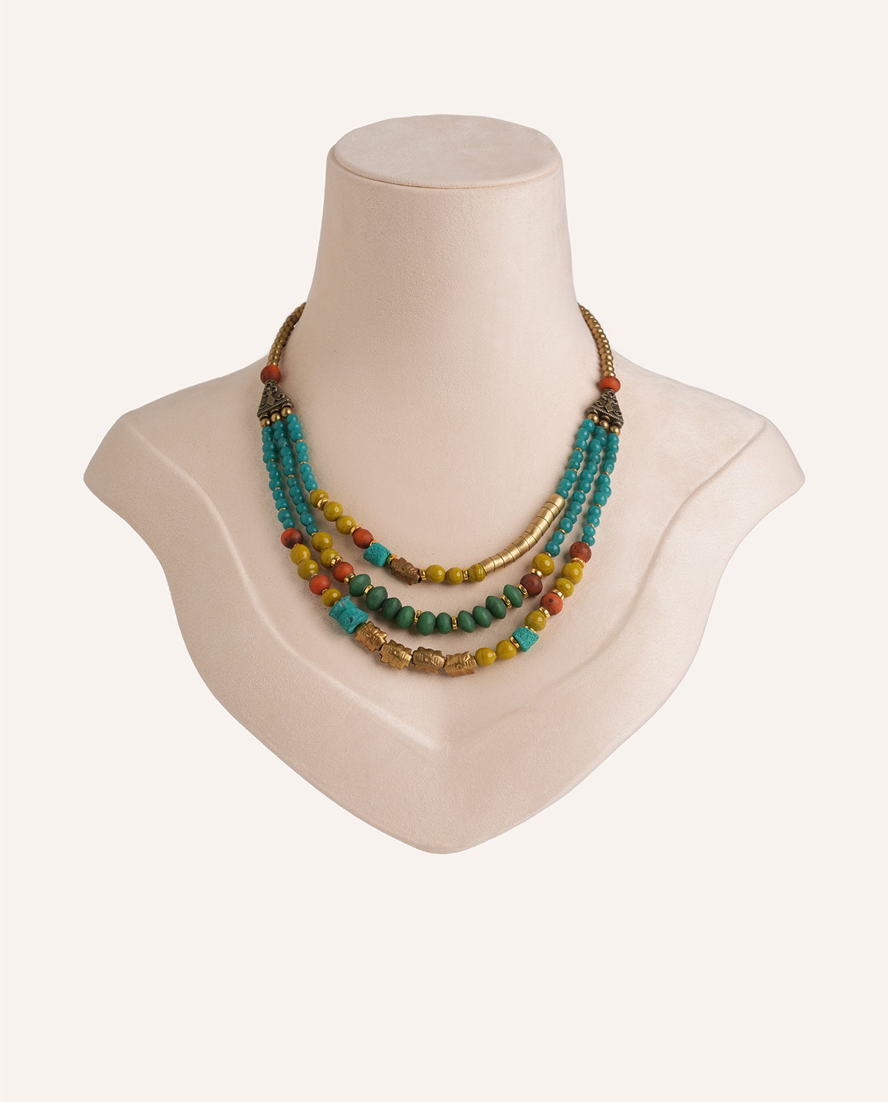 – Présente des perles aux couleurs vives turquoise, vert olive, jaune moutarde et tons corail.