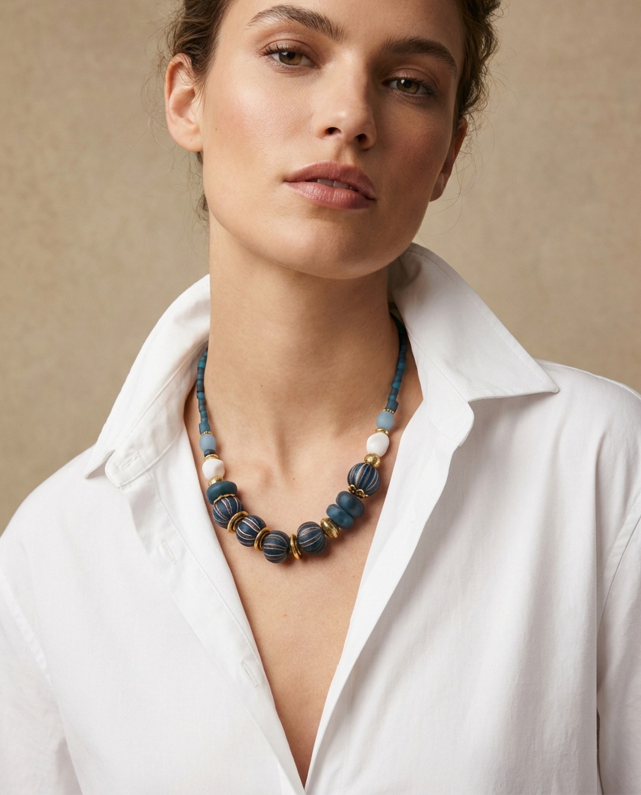 Design: A statement necklace with a symmetrical arrangement highlighted by prominent central striped beads. Color: A harmonious palette of petrol-blue and navy-gradient beads with white accents and gold-tone details. Length & presence: Short, collar-emphasizing length that creates a strong focal point on its own. Styling: Pairs effortlessly with everything from simple shirts to evening dresses. Finish: The contrast between beads of varying diameters and textures delivers a modern yet elegant expression.