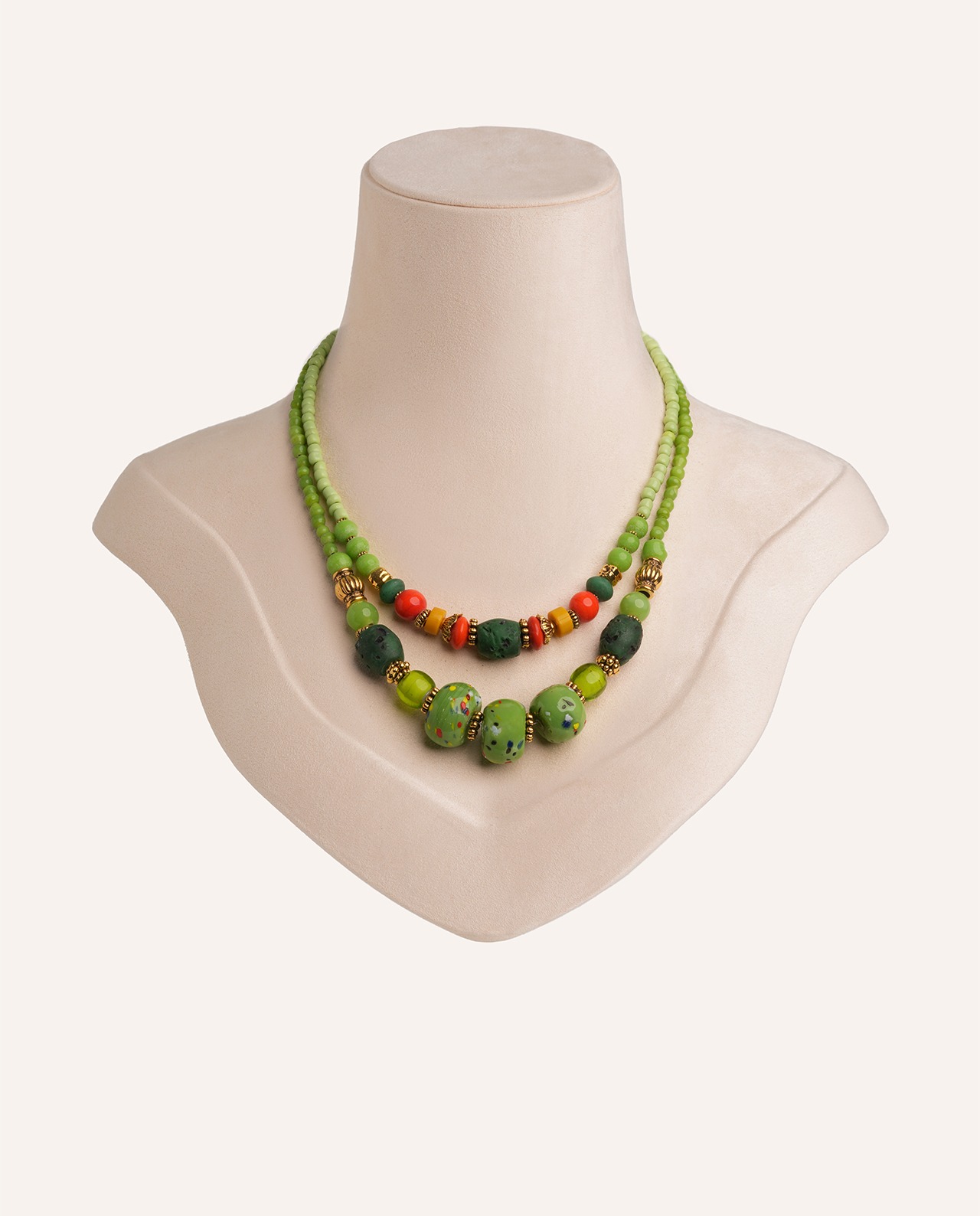 Featuring two rows of beads in varying sizes for dynamic dimension, this necklace blends vivid shades of green with small orange and yellow accent beads to create a warm, eye-catching contrast. Gold-tone spacer details and mixed bead textures add richness and depth. Easily paired with open-necklines and simple tops for effortless styling, it stands out as a striking everyday accessory. Versatile and summery, it brings a boho touch to your wardrobe—equally impressive worn alone or layered.