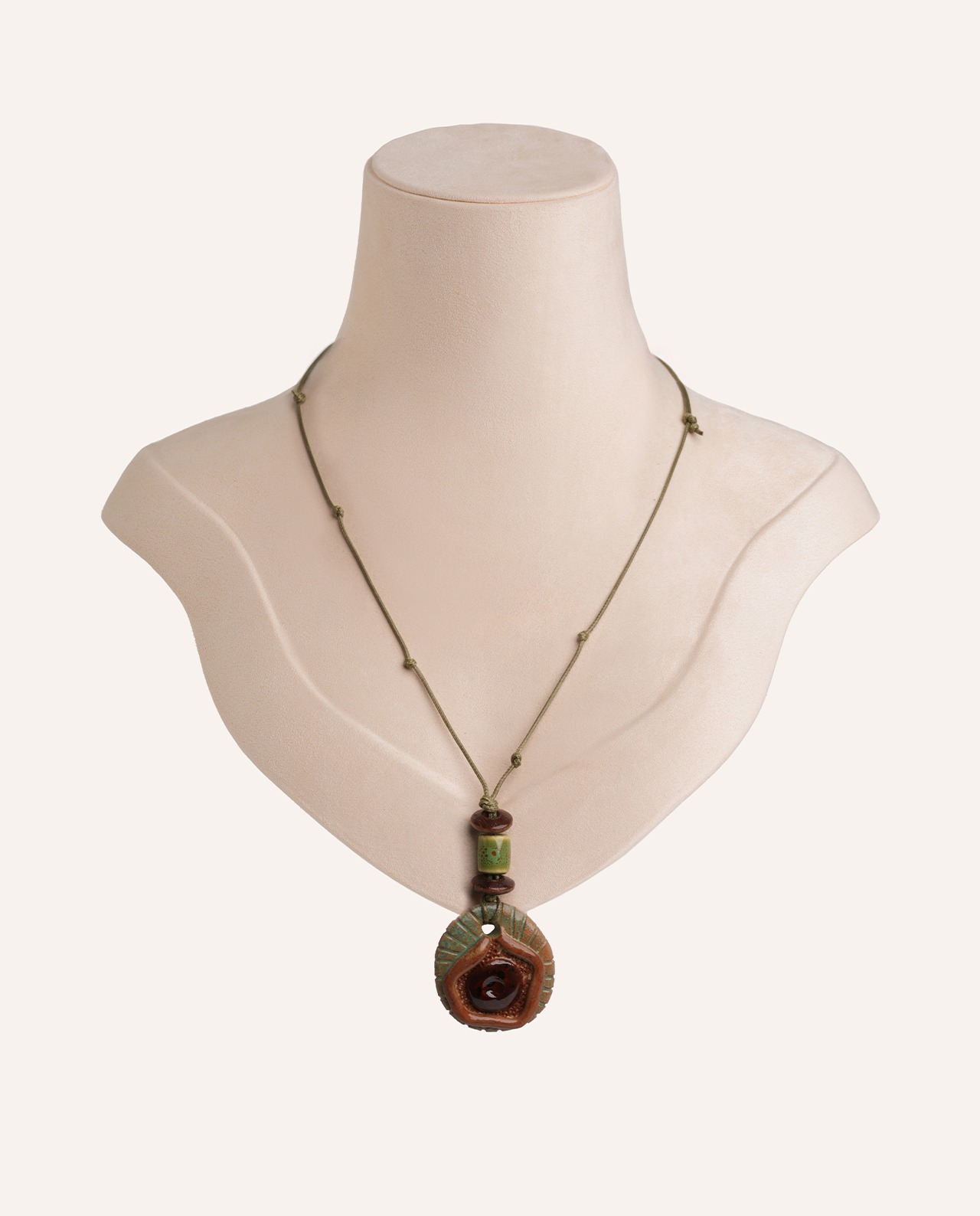 The main pendant is handcrafted by ceramic artists, so each piece carries its own character. Earthy green and brown accents give the necklace an organic, calming look. The thin knotted cord is adjustable for length, offering comfortable, personalized wear. Bead details enrich the composition and instantly enliven even the simplest outfits. With the Fingerprint series’ aesthetic, this piece feels more like a small work of art than just jewelry. Styling suggestion: pairs naturally with a white shirt, a linen blouse, or bohemian dresses—an elegant, eye-catching piece that transitions effortlessly from day to night.